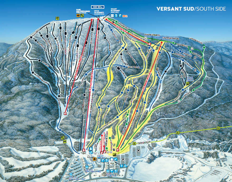 When it comes to getting around Mont-Sainte-Anne, the resort features abundant, well-placed signage across the mountain. However, the resort’s highly three-dimensional footprint—particularly around the crowded summit area with its frequent double fall lines—can sometimes make navigation challenging. Guests aiming to access the north or west sides from the summit should study the trail map carefully and follow signage closely, as it’s surprisingly easy to accidentally drop into the expert-only Panorama zone.
